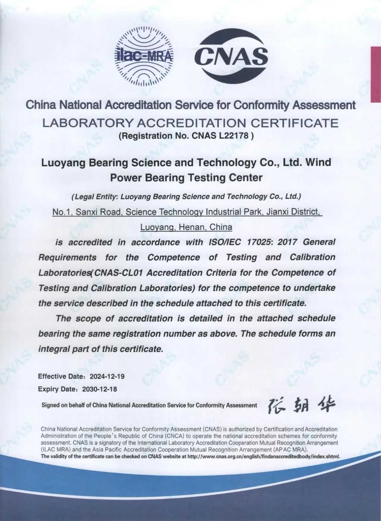The Wind Power Bearing Testing Center of our company has successfully obtained the laboratory accreditation certificate issued by the China National Accreditation Service for Conformity Assessment (CNAS) (Registration No.: CNAS L22178). This achievement signifies that the center’s technical capabilities and management systems meet both domestic regulatory requirements and international standards. Moreover, the accuracy and reliability of its test data have been officially recognized by an authoritative third-party organization.