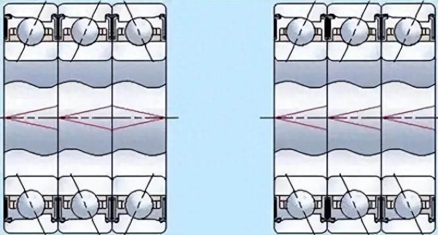 Three single-row angular contact ball bearings are mounted in a triple configuration, capable of supporting radial and axial loads in both directions. However, this type of assembly is prone to uneven load distribution, especially under high-speed rotation conditions, which can easily cause bearing damage. Therefore, it is usually not suitable for high-speed rotation working environments.