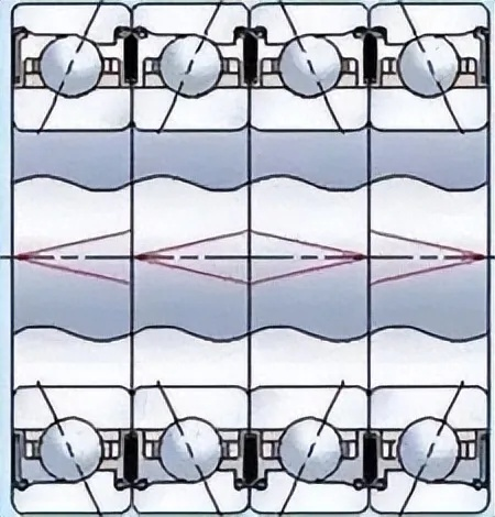 A quadruple arrangement of four single-row angular contact bearings can also simultaneously withstand radial and bidirectional axial loads. Under the same internal clearance, its preload and rigidity are twice that of ordinary assembly, so it can withstand a larger ultimate axial load.